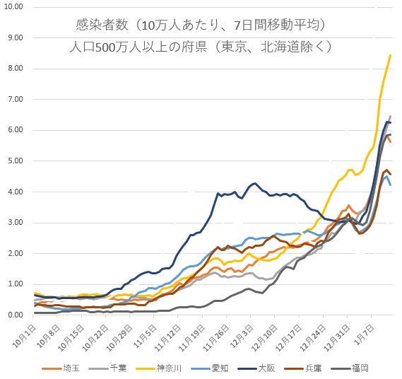 上のグラフは人口500万人以上の都道府県で比較した、人口10万人当たりの感染者数(7日間移動平均)の推移のグラフです。データはNHKの新型ウイルス特設サイトからダウンロードしたものを元データとして使っています。