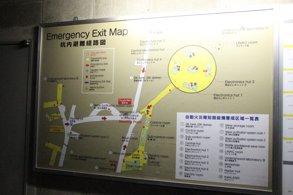 これは坑内の避難経路図。黄色の丸い部分がスパーカミオカンデ本体。スーパーカミオカンデの上は大人数が乗ることができないので、半分ずつに分かれ、説明を受ける班と周りの見学の班に分かれる。時間が少なく、ゆっくり見学できなかった印象でちょっと残念。