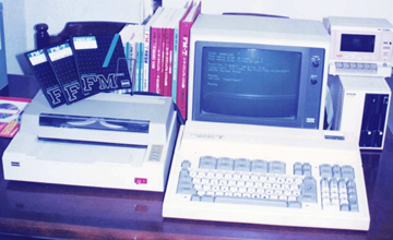 当時使っていたパソコン富士通FM7。本体以外にプリンター(熱転写式白黒)9万円、フロッピーディスクドライブ(5インチ)10万円、フロッピードライブの上にあるのは当時外部記憶装置として使っていたカセットテープドライブ(音楽カセットに記憶する。しょっちゅうエラーが出て大変だった)。